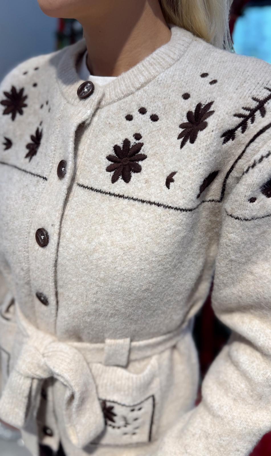 BEJ NAKIŞLI ÇİÇEKLİ KEMERLİ HIRKA (ST01694-BEJ-STD)
