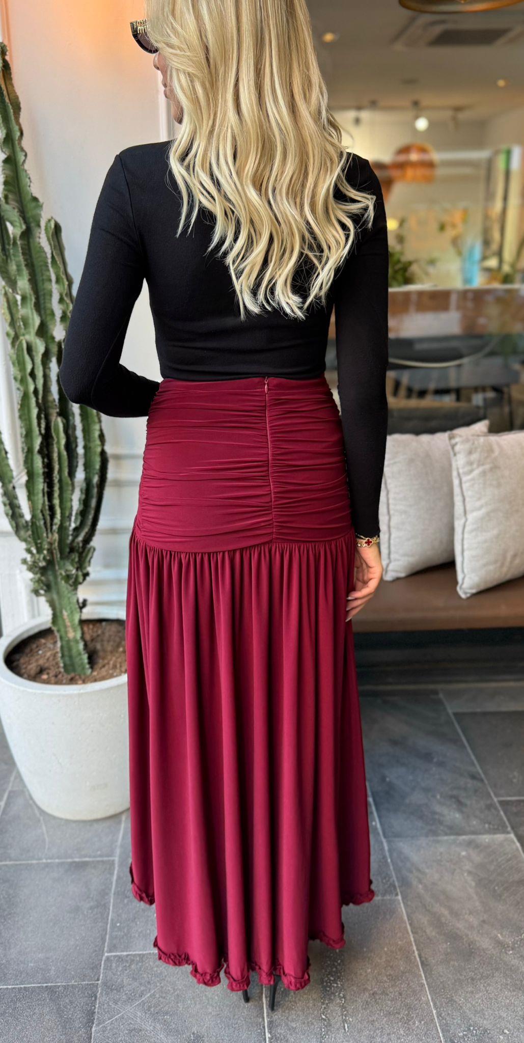 BORDO DRAPELİ YIRTMAÇLI TASARIM ETEK (ST01521-BORDO-XS)