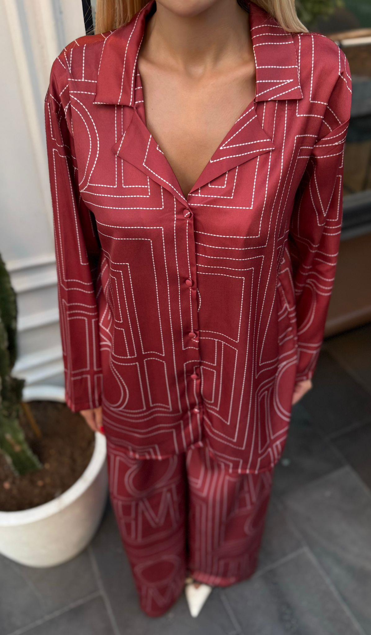 BORDO GEOMETRİK DESEN GÖMLEK PANTOLON TAKIM (ST01498-BORDO-S)