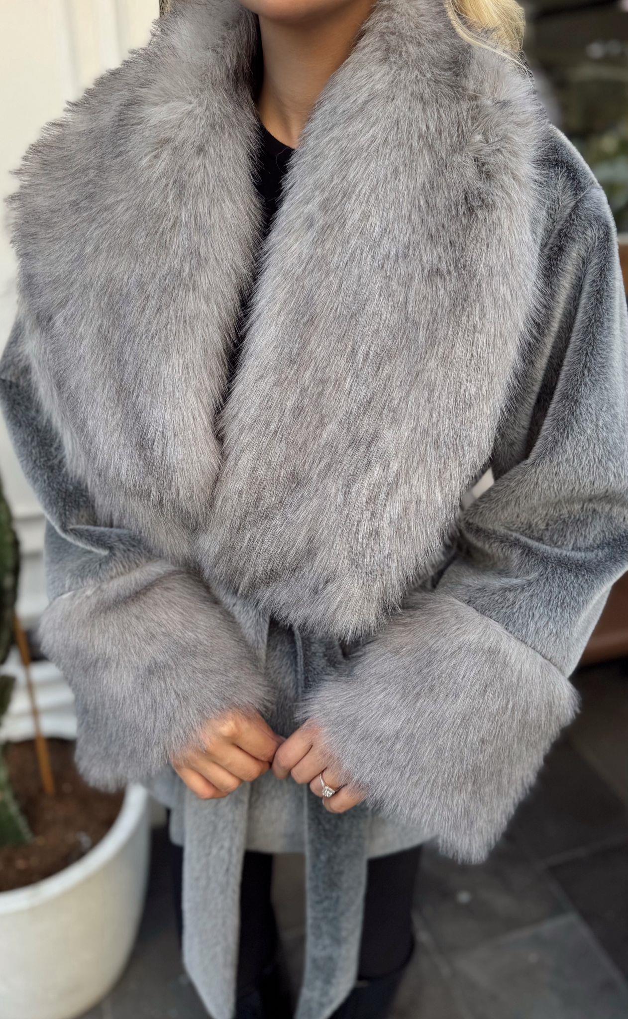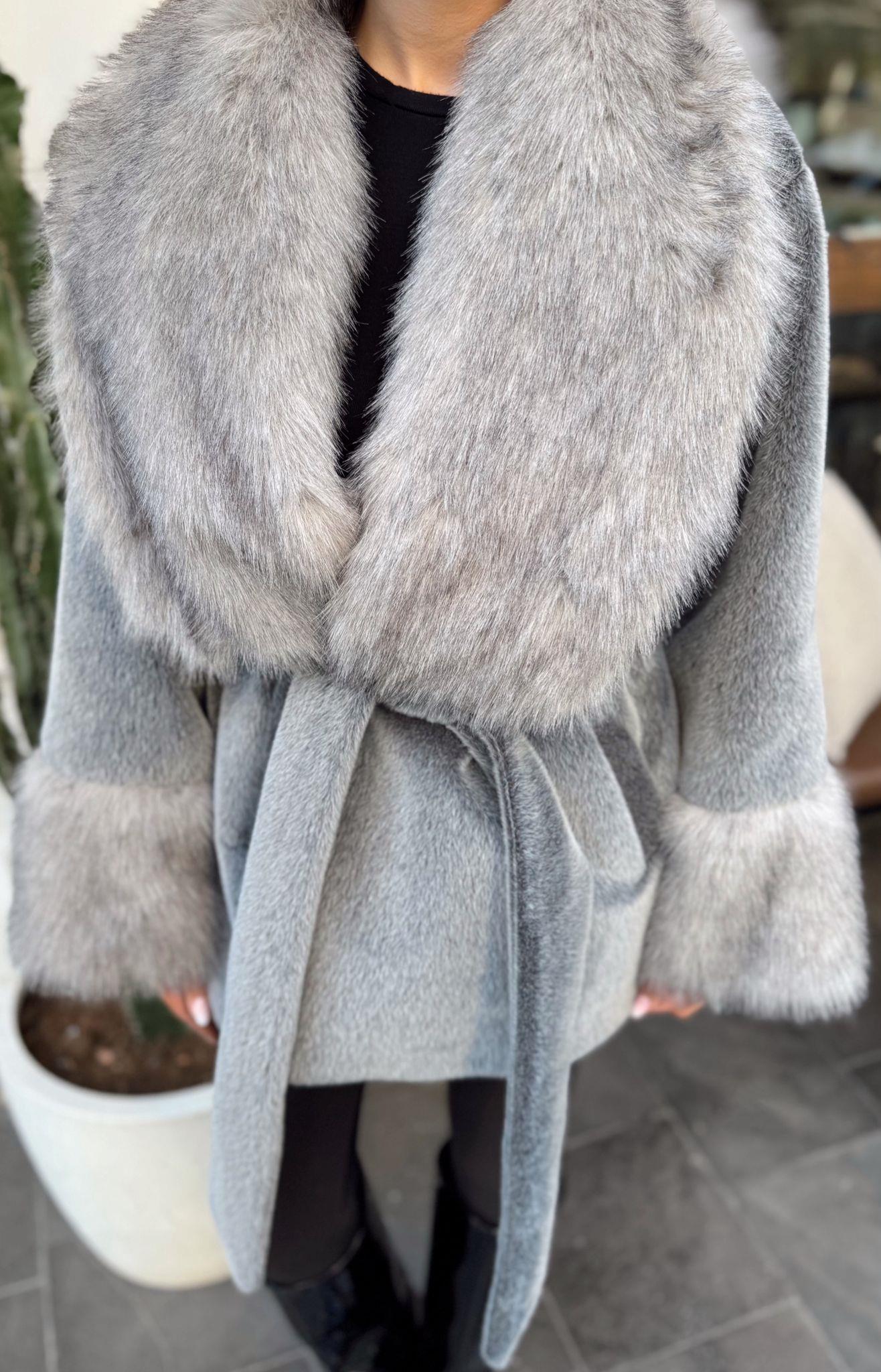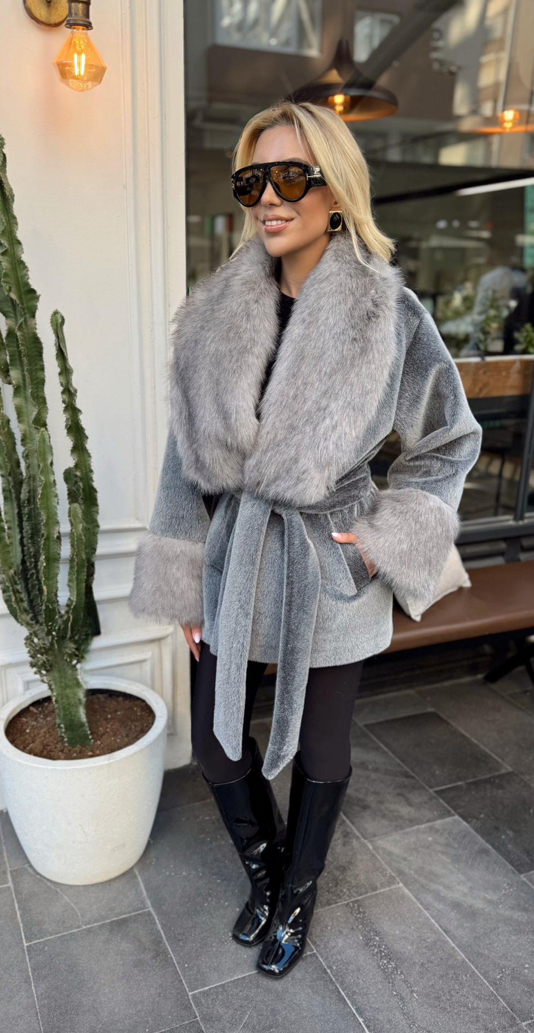 GRİ TASARIM YAKA VE KOL KÜRK DETAYLI KABAN (ST01527-GRİ-1)