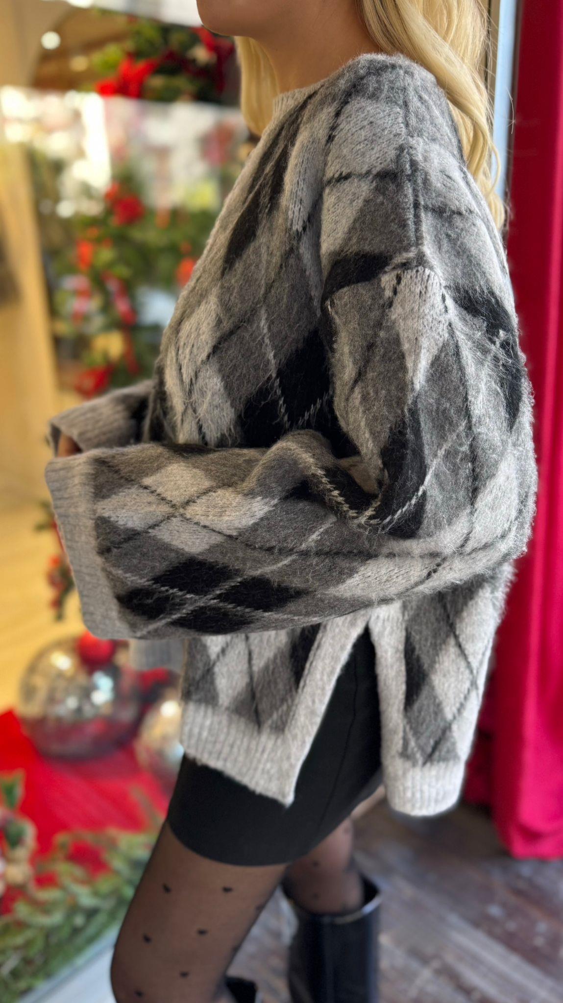 GRİ YANLARI YIRTMAÇLI ŞARDONLU BAKLAVA KAZAK (ST01613-GRİ-STD)