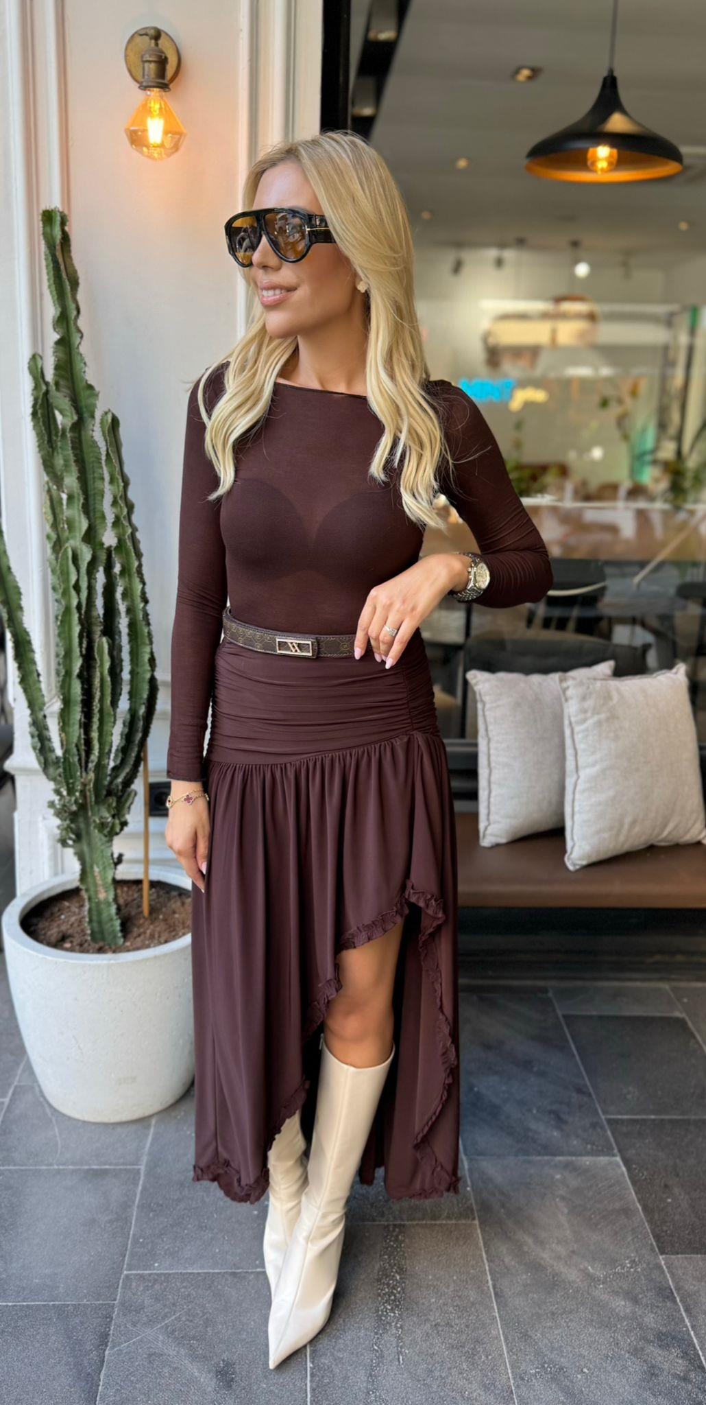 KAHVE DRAPELİ YIRTMAÇLI TASARIM ETEK (ST01521-KAHVE-XS)