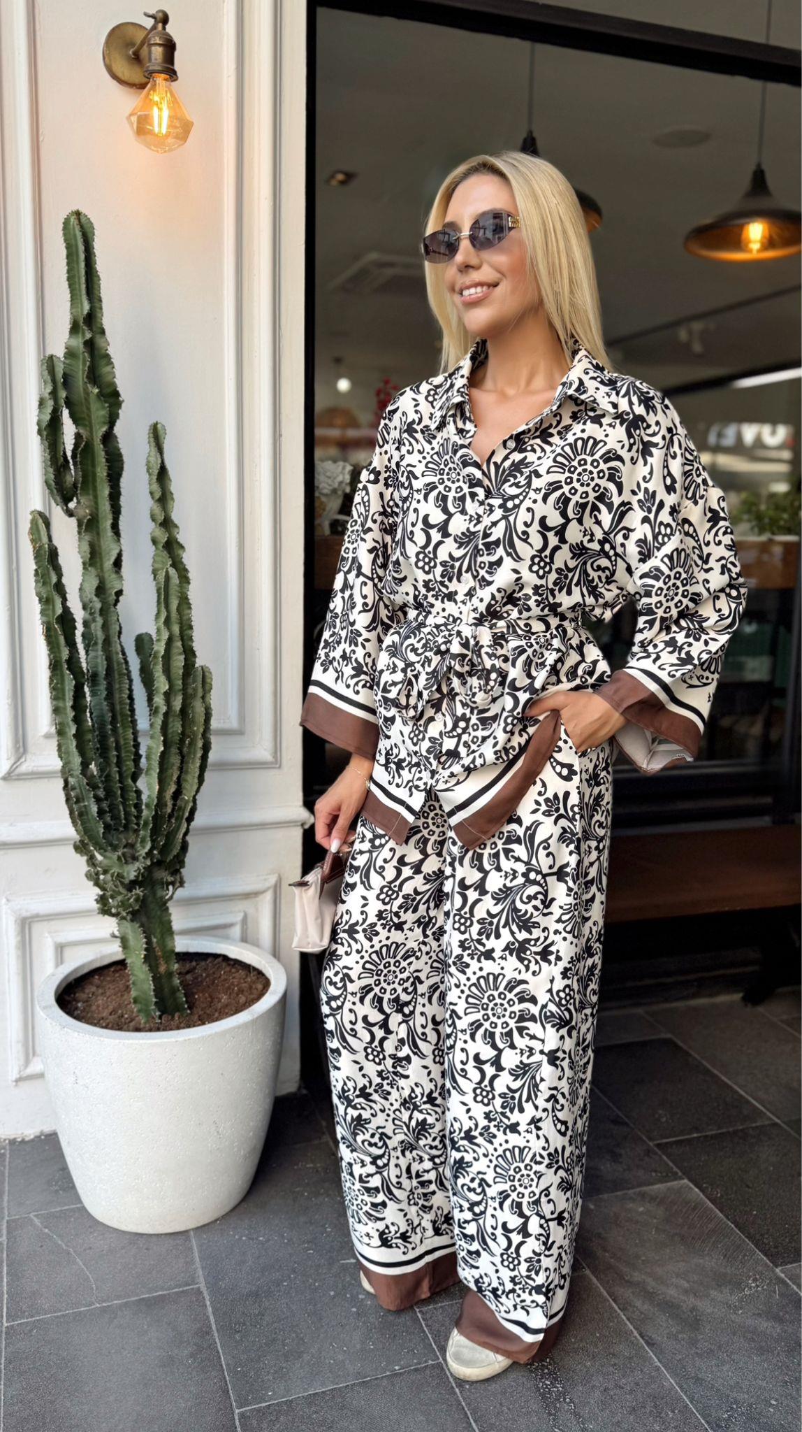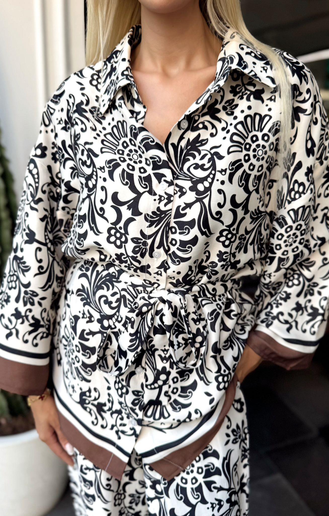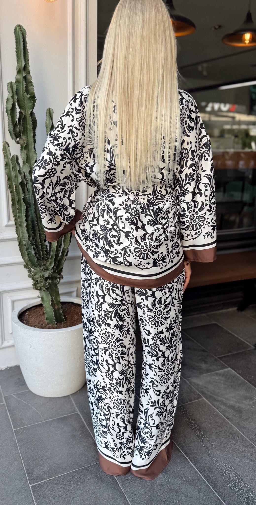 KAHVE DESENLİ PANTOLON GÖMLEK SATEN TAKIM (ST01469-KAHVE-S)