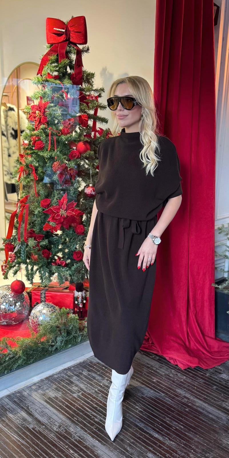 KAHVE KUŞAKLI TRİKO MİDİ ELBİSE (ST01614-KAHVE-STD)