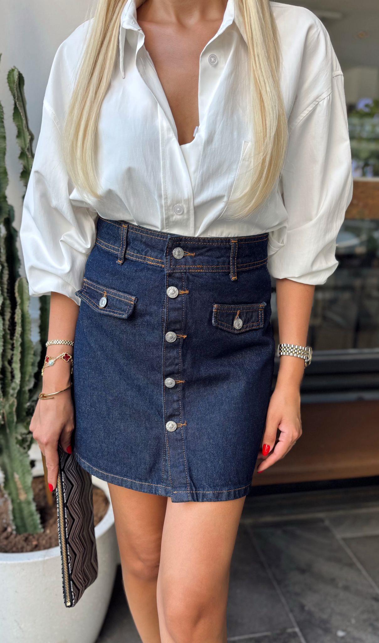 LACİVERT SÜS CEPLİ DÜĞMELİ DENİM ETEK (ST01489-LACİVERT-S)