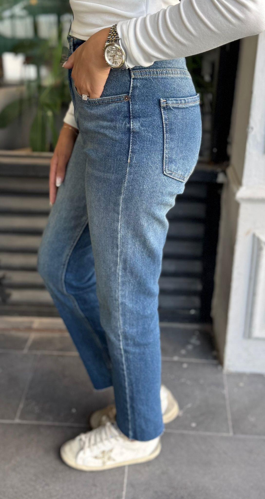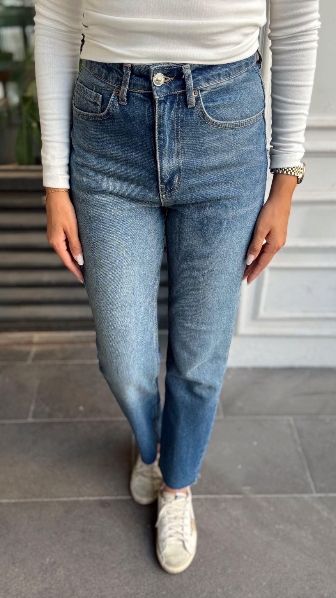 YÜKSEK BEL, BEŞ CEPLİ, ÖNÜ METAL DÜĞMELİ VE FERMUARLI PAÇASI KESİK JEAN