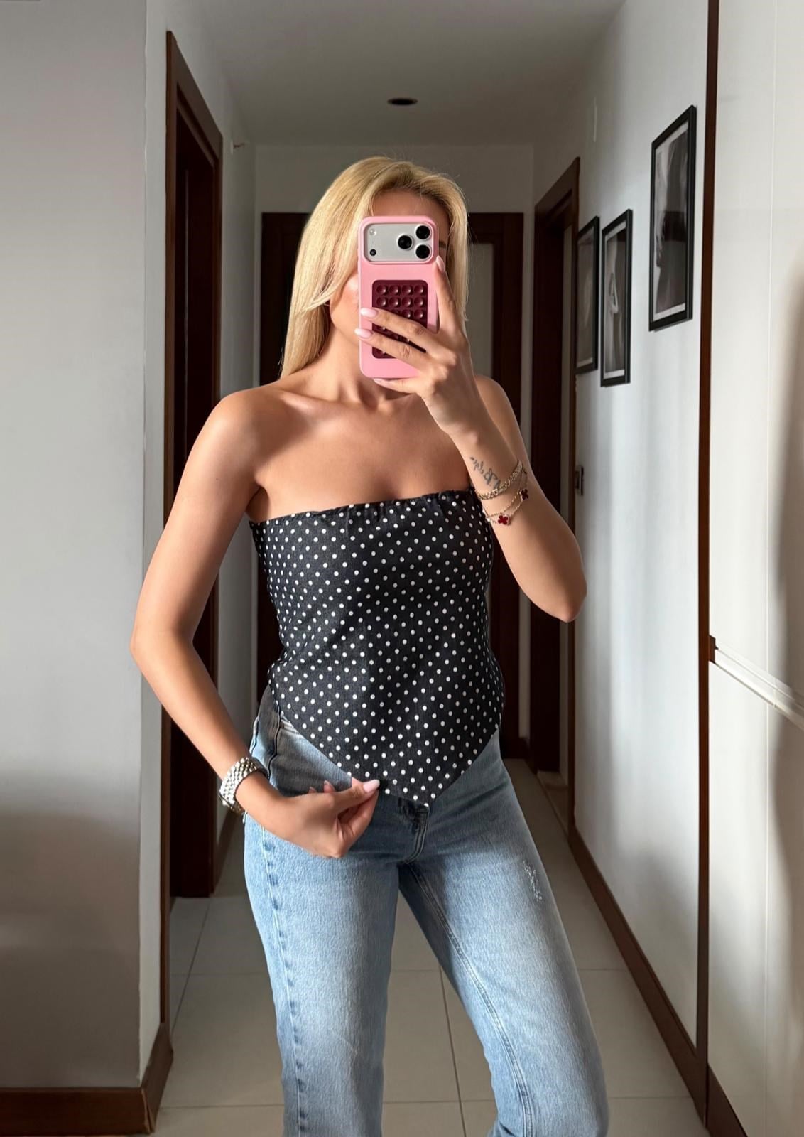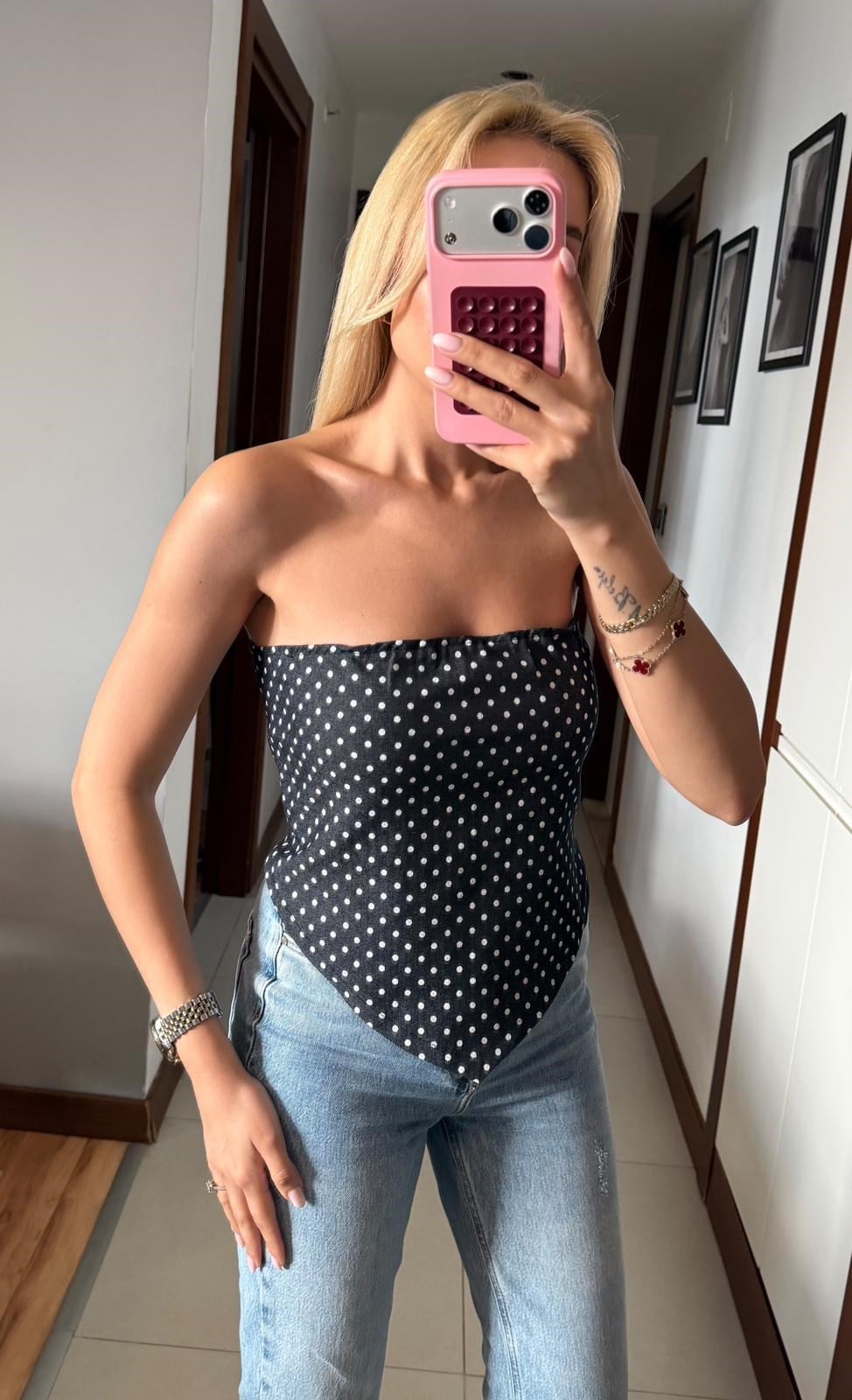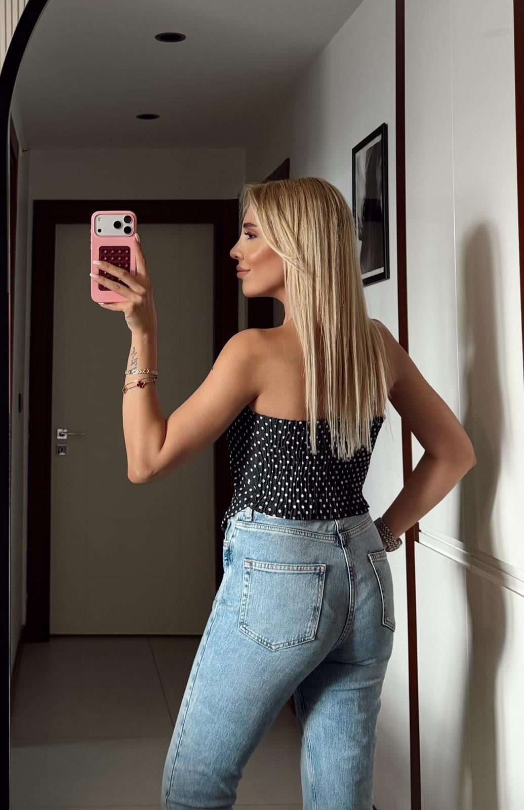 PUANTİYELİ DENİM STRAPLEZ BLUZ (ST01870-LACİVERT-S)