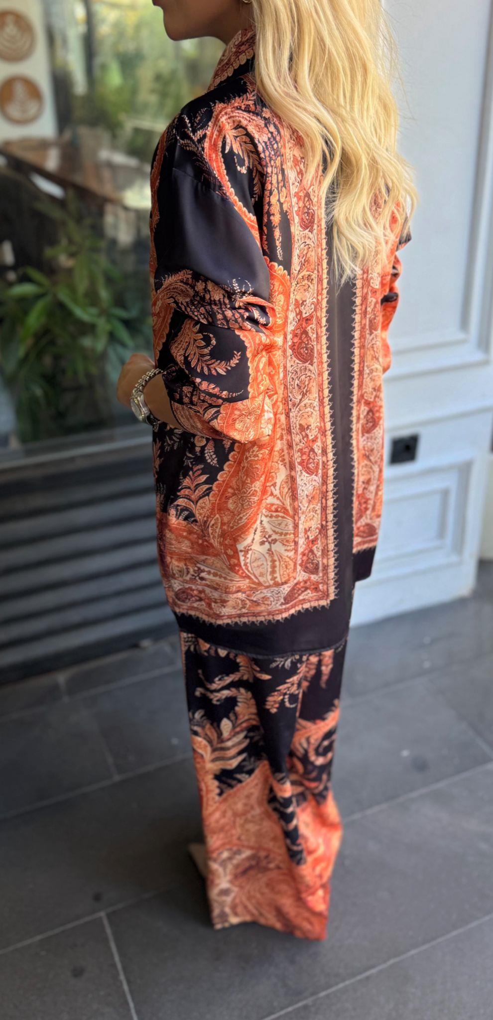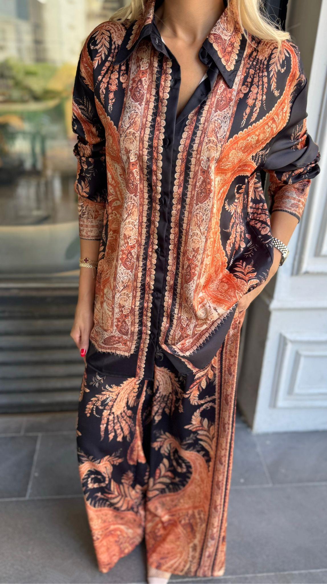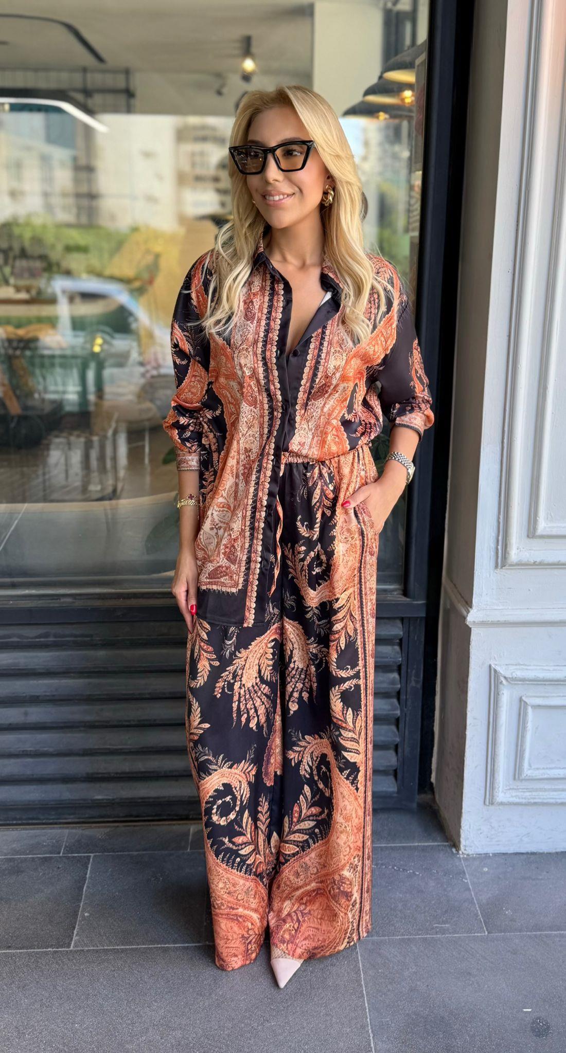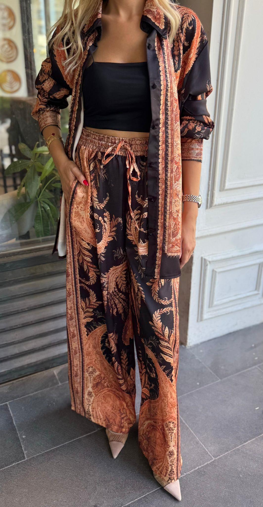 SATEN ŞAL DESENLİ GÖMLEK PANTOLON TAKIM (ST01505-KAHVE-S)