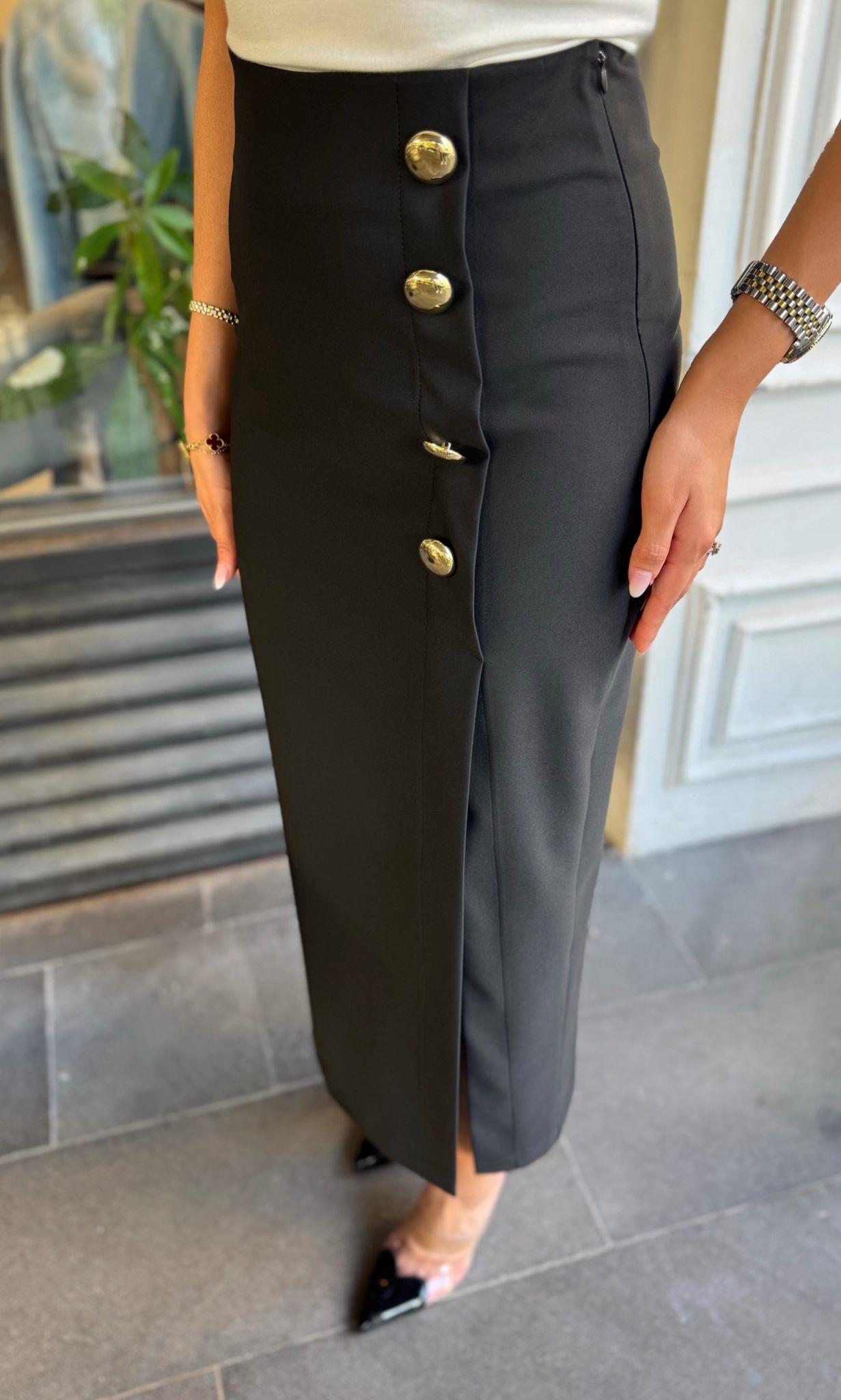 SİYAH 4 GOLD DÜĞMELİ YIRTMAÇLI MİDİ ETEK (ST01534-SİYAH-S)