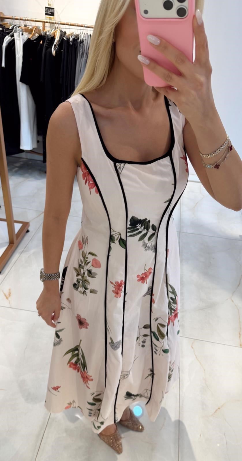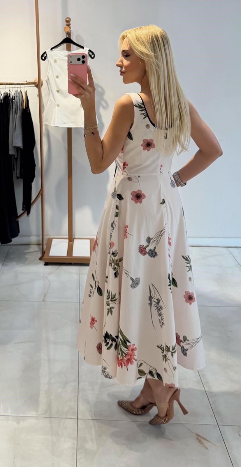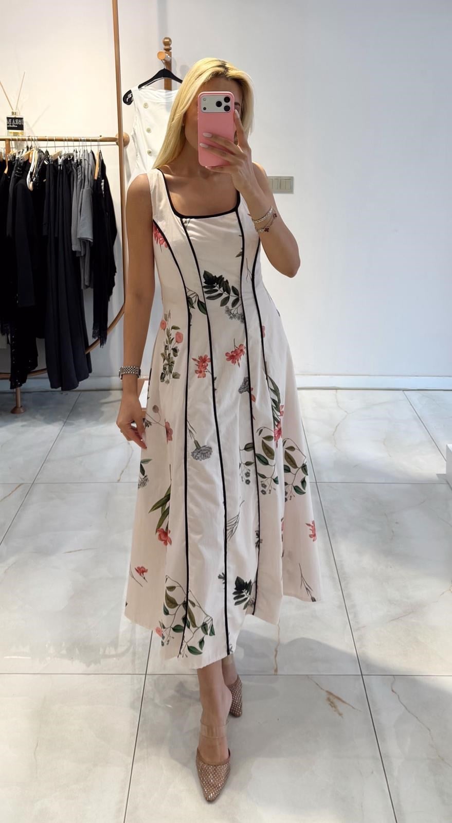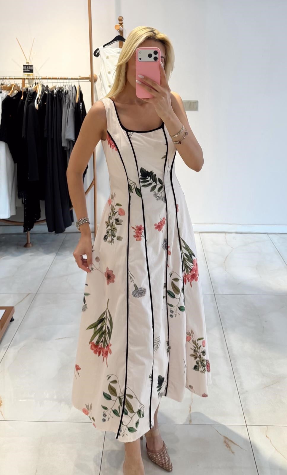 SİYAH BİYELİ ÇİÇEKLİ MİDİ ELBİSE (ST01791-EKRU-S)