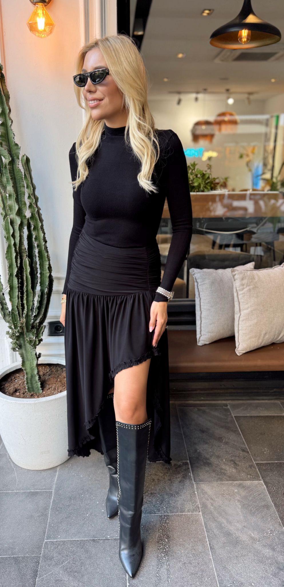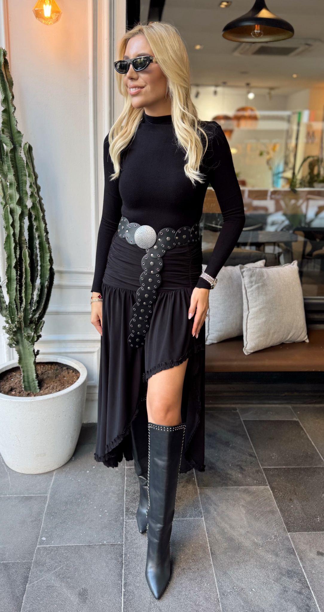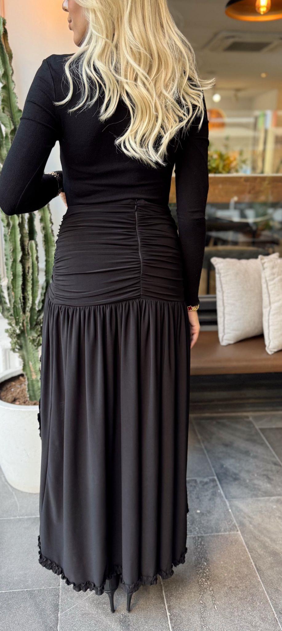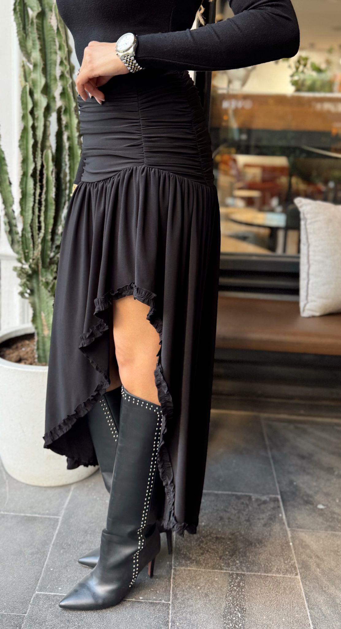 SİYAH DRAPELİ YIRTMAÇLI TASARIM ETEK (ST01521-SİYAH-XS)