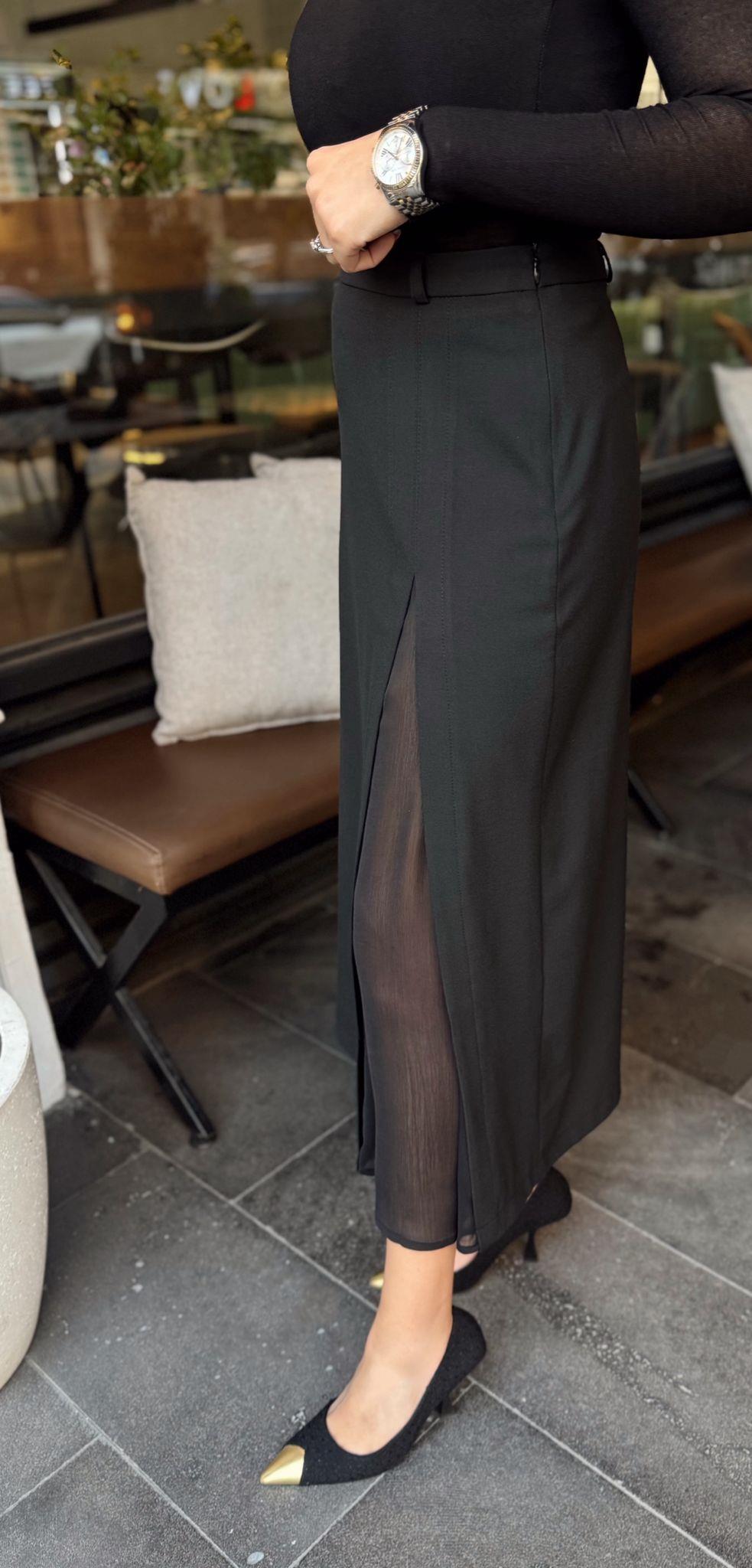 SİYAH KREP KUMAŞ TÜL YIRTMAÇLI MİDİ BOY ETEK (ST01589-SİYAH-S)