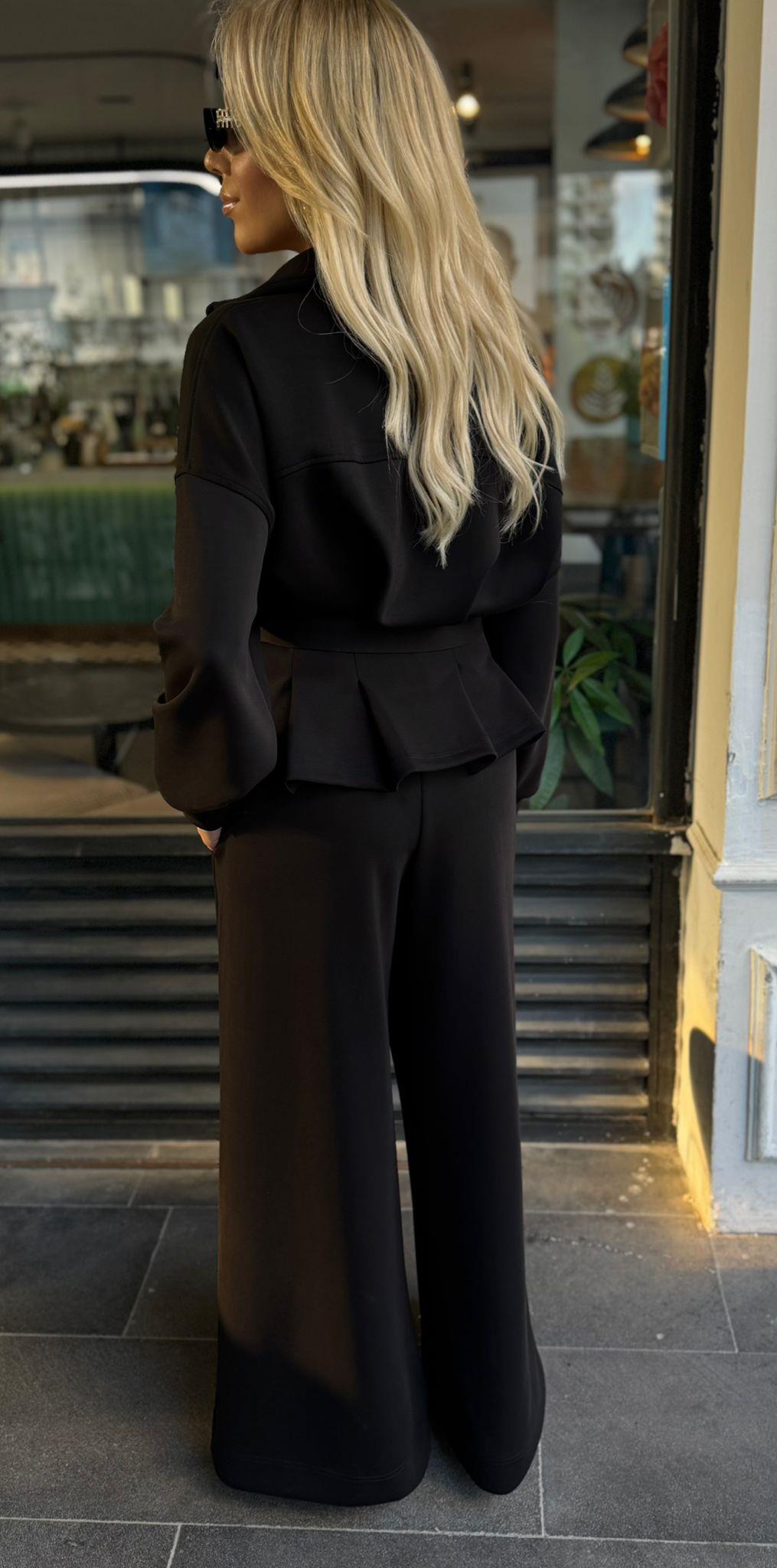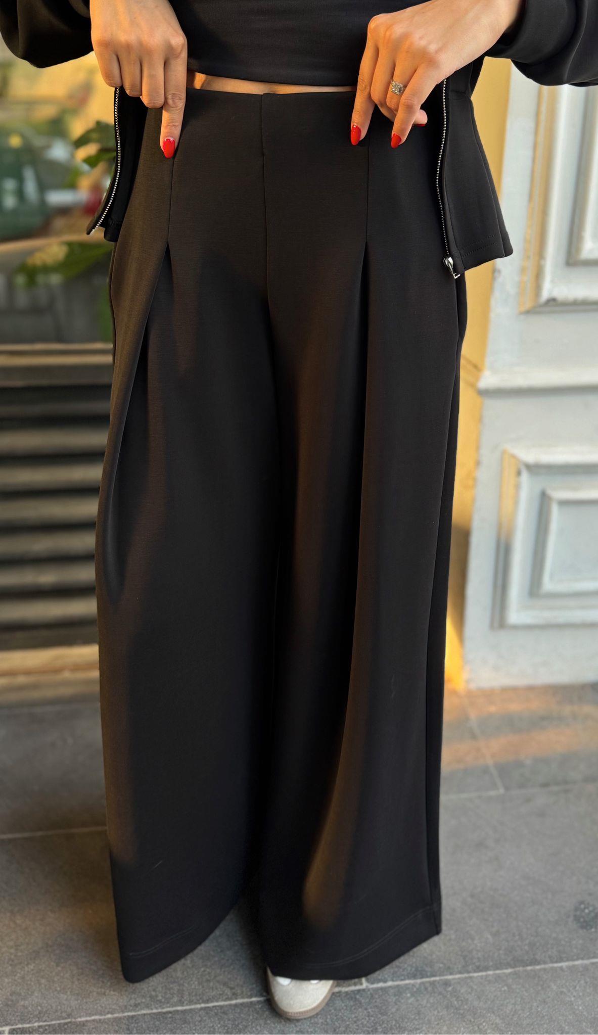 SİYAH MODAL KUMAŞ KEMER DETAY GENİŞ PAÇA TAKIM (ST01515-SİYAH-S)